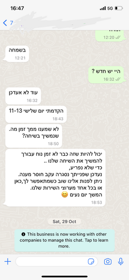 הפעולה המיידית הבאה שלו אחרי חיפוש באתר החברה - פניה למוקד השירות בוואטסאפ. המענה שהתקבל הוא שמוקד הוואטסאפ סגור ויפתח רק ביום ראשון.